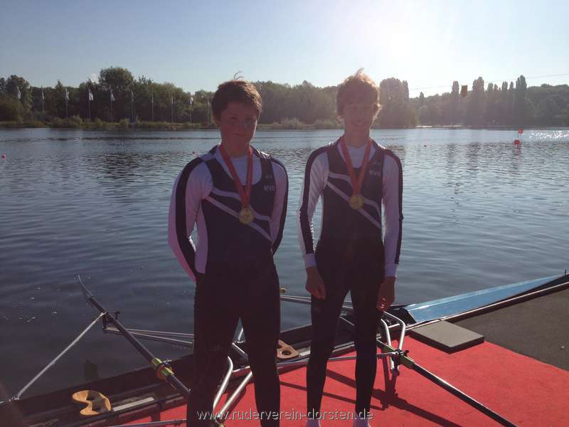 Ebenfalls nicht unbemerkt verlief die Langstreckenpremiere von Carolin Doerfler und Isabell Ritlewski im Juniorinnen A Zweier ohne Steuerfrau Mit einem guten zehnten Platz erreichte das Duo die vorab gesteckten Ziele und kann sich nun berechtigte Hoffnungen machen, von Landestrainer Wenzel für einen Lehrgang der NRW Verbandsauswahl nominiert zu werden. "Ein starkes Ergebnis, wenn man bedenkt, dass beide erst seit knapp einem Jahr rudern", so RVD Vereinstrainer Ulrich Wyrwoll über die Leistung seiner Schützlinge. Hierzu gehört auch Tine Gerling. Auch sie rudert erst seit knapp einem Jahr, auch sie startete am Samstagnachmittag auf der 6.000 m Strecke. Im Juniorinnen A Einer wurde sie 35, ein Ergebnis mit dem Athletin und Trainer sicherlich zufrieden sein dürften. Sonntagvormittag ging es mit den Premieren auf der Langstrecke aus Dorstener Sicht weiter. Grade zu den B-Junioren aufgestiegen sind Moritz Büchler und Aaron Kiersch. Beide starteten im Doppelzweier und erreichten total erschöpft, aber glücklich das Ziel als Zehntplatzierte. Beide sind erst seit kurzer Zeit im Juniorenteam des RVD dabei, Aaron rudert sogar erst seit Augst. "Hier ist das Ergebnis erst einmal zweitrangig, viel schöner ist es, dass beide diese Aufgabe so konsequent angegangen sind", so Trainer Sebastian Schmelzer über die Leistung der beiden.