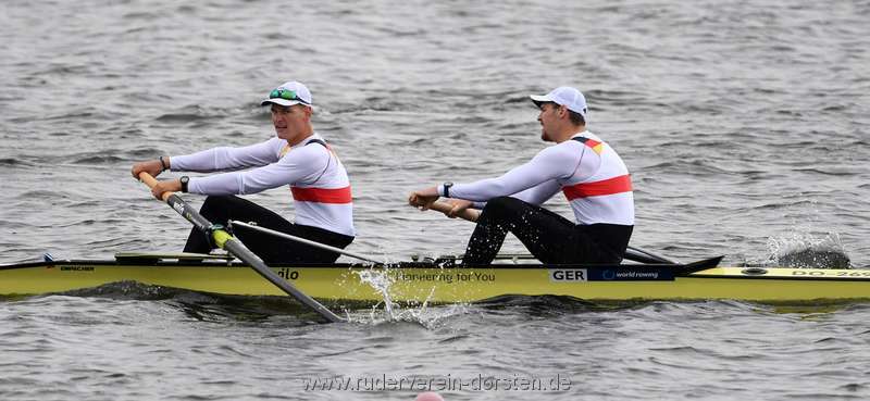 "Wir hatten optimistisch auf Bronze geschielt, Gold ist es geworden. Eine ganz starke Leistung", so das Fazit seines Trainers. Silbermedaille im Männer-Zweier Den dritten Titel des Wochenendes verpassten Benedikt und Lukas Müller im Männer-Zweier um 0,8 Sekunden. Da nur sechs Boote gemeldet hatten, ging es für die international erfahrenen Müller-Brüder direkt im Finale um die Medaillen im Zweier ohne Steuermann. Hier wartete ein ebenfalls sehr erfahrenes Starterfeld mit den Juniorenweltmeistern aus Münster, den U23 Nationalmannschaftsruderern Leske/Gebel vom heimischen Crefelder RC oder etwa Laurits Follert, der vor einer Woche noch im Männer Vierer bei den Weltmeisterschaften in Florida am Start war. In einem engen und lange offenen Rennen siegten die Münsteraner, knapp vor Dorsten und Krefeld. "Die beiden Brüder in einem Boot zu sehen ist immer wieder schön und ich hoffe, dass die beiden das noch ein paar Jahre machen. Wir freuen uns über eine gewonnen Silbermedaille", so Uli "Ötte" Wyrwoll, der die Müller Brüder während der Juniorenjahre in Dorsten trainierte.