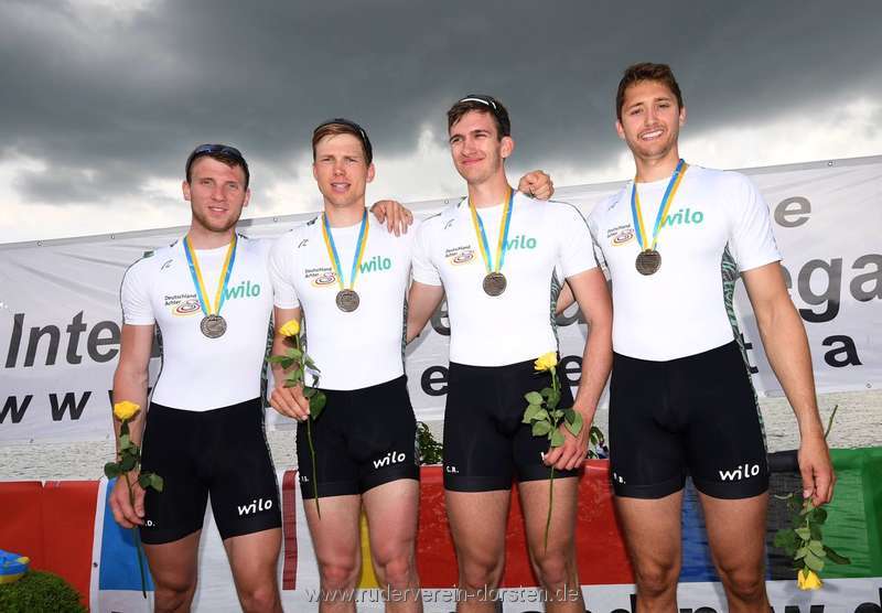 Mit gemischten Gefühlen kehrten Ruderer und Trainer des RV Dorsten von den diesjährigen Deutschen Meisterschaften der Altersklassen U17-U23 zurück, die vom 21. bis 25. Juni 2017 auf der Olympischen Regattastrecke von 1972 in München-Oberschleißheim stattfanden. Zur größten Herausforderung des Wochenendes sollte die Hitze werden, die die 1200 Ruderer mit Temperaturen jenseits der 30-Grad-Marke bis zum Letzten forderte. Benedikt Müller gewinnt Silber im Vierer und Achter Mit den besten Erfolgsaussichten ging Benedikt Müller in der U23 Altersklasse an den Start. Nachdem er für die Mannschaftsbildung für den U23 Achter des Deutschen Ruderverbands nicht berücksichtigt wurde, sollte Benedikt sich in München im Vierer mit Steuermann für die Ende Juli in Plovdiv stattfindende U23-WM empfehlen. Zusammen mit Leon Schandl (Minden), Lukas Geller (Krefeld), Jacob Schulte-Bockholt (Krefeld) und Steuermann Jonas Wiesen (Treis-Karden) startete der 22-jährige Kirchhellener jedoch gegen das von den Bundestrainern Holtmeyer und Thiede favorisierte Boot der Renngemeinschaft Stralsund, Rostock, Osnabrück, Dortmund und die Kombination der Renngemeinschaft Köln, Siegburg, Leverkusen, Team Nordwest. Auf den ersten 750 m machten Müller & Co ordentlich Tempo und ruderten eine dreiviertel Bootslänge auf die Konkurrenz heraus. Über die Streckenmitte schoben die Ruderer der favorisierten Renngemeinschaft ihr Boot aber immer besser vorwärts. Mit Spurts versuchten Müller & Co vergeblich zu kontern, hatten im Kampf um die Goldmedaille und die damit verbundene WM-Nominierung aber letztendlich das Nachsehen. Mit einer guten Bootslänge Rückstand reichte es zur Silbermedaille.