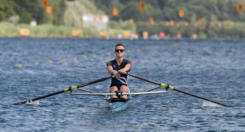 Elf Boote hatten im Junioren-Doppelzweier der A-Junioren gemeldet, so dass dort Vorläufe ausgefahren werden mussten, um die sechs Finalisten zu ermitteln. Für den RV Dorsten gingen Lennart Kötters und Julius Gülker gegen die starke Konkurrenz aus Münster, Neuss, Bad Godesberg, Herten und Bonn an den Start. Vom Start weg waren die beiden Dorstener "mit bei der Musik" und mussten lediglich den Doppelzweier aus Münster ein wenig ziehen lassen. Im Ziel bedeutete der zweite Platz die souveräne Qualifikation für das Finale. Dieses beendeten Lennart und Julius auf Platz 6. Im Juniorinnen B Doppelzweier gingen Paula Jakschick und Rosa Schmidt mit Außenseiterchancen in den Vorlauf am Samstagvormittag. In dem gut besetzten 6-Boote Feld hielten sie lange mit und verpassten die Finalqualifikation mit Platz 4 knapp um zwei Sekunden. Am zweiten Meisterschaftstag standen für Julius Gülker und Hendrik Winkel zunächst die Vorläufe im Einer der A-Junioren auf dem Programm. 20 Boote hatten für den Kampf um Gold, Silber und Bronze gemeldet und fuhren in vier Vorläufen die sechs Finalisten aus. Aufgrund einiger Abmeldungen verschob sich die Setzung für die Vorläufe kurzfristig, so dass Gülker und Winkel gegeneinander antreten und zur Finalqualifikation die ersten beiden Plätze belegen mussten. Während Hendrik Winkel vom Start weg einen nie gefährdeten Vorlaufsieg einfuhr, setzte sich Julius Gülker schlussendlich mit einer guten Bootslänge vor dem Mitfavoriten aus Bonn durch und folgte somit seinem Vereinskameraden ins Finale. Im Finale kam es dann zum Showdown zwischen dem NRW Ranglistensieger und Junioren WM Teilnehmer Sören Henkel aus Waltrop und Hendrik Winkel. Beide lieferten sich ein Duell vor dem Rest des Feldes, in dem Julius Gülker auf Platz 6 ins Ziel kam. Gold ging an Waltrop, Silber an Hendrik Winkel und Bronze nach Hürth.
