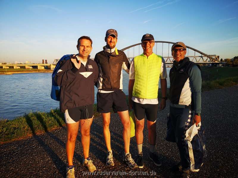 Schon im Frühjahr erreichte uns die Einladung zu einer bislang einmaligen Veranstaltung des Landesverbandes NWRV und des Duisburg-Homberger Ruderklubs Germania zum NRWRT Homberg 2018. Anlässlich des 125-jährigen Bestehens des Vereins sollten mindestens 125 Ruderer mit Ziel Homberg vom 125 Km entfernten Bonn oder anderen Vereinen längs des Rheins nach Homberg rudern. Für die schöne Idee hatte ich im Verein geworben, am Ende blieben nur drei Dorstener Meldungen von Sabine, Andy und mir. Wir hatten für eine Tour ab Neuss (46 Km) gemeldet. Kai-Uwe, engagierter Organisator aus Homberg, ließ uns vor einigen Tagen wissen, dass er hier noch disponieren muss, bot uns zugleich freie Plätze im Kirchboot der TPSK Köln an. Hmm, doppelte Strecke, aber Kirchboot... kurzer Entschluss - klar, machen wir! So standen wir gestern mit den Hühnern auf, um gegen 8 Uhr in Köln-Mülheim einzusteigen, wo die Kölner tags zuvor ihr Boot im Hafen per Kran einsetzen ließen. Ein sonst übliches Slippen an anderer Stelle war wegen Niedrigwasser nicht möglich.