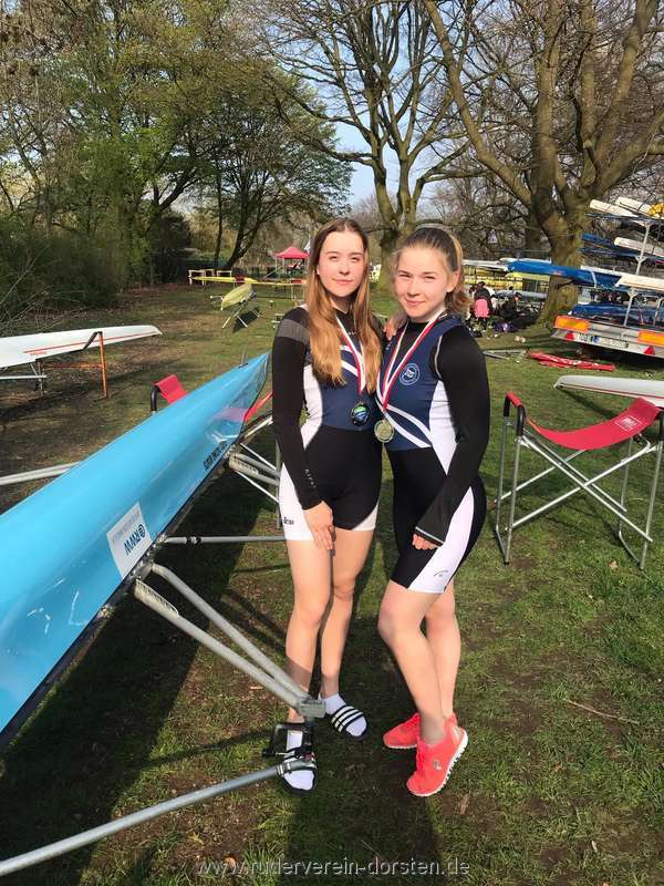 Die 49. Aaseeregatta auf dem diesmal sonnigen aber windigen Aasee im schönen Münster war zum Saisonauftakt für leistungsorientierte Junioren der 15- bis 18-jährigen sehr gut besucht. Nach langem intensiven Wintertraining mussten sich erstmalig auch Dorstener B-Junioren auf der 1500 Meter-Distanz und A-Junioren/innen auf der 2000 Meter-Distanz beweisen. Anton Böckenhoff, der in dieser Saison bei den Leichtgewichten startet, kam an beiden Tagen in drei Einerrennen nicht über Platz drei hinaus, ebenso Nils Tristram, der bei den schweren B-Junioren - ebenfalls im Einer - nicht immer mit der seitenwindanfälligen Strecke zurechtkam und mehrmals Bojenberührung hatte, was bei zwei Rennen zweimal Platz drei im vollen Fünf-Boote-Feld bedeutete. Auch beide A-Junioren mussten bei zwei Einerrennen und einem Doppelzweier-Rennen die Gegner, die diesmal nicht nur aus NRW kamen, vorbeiziehen lassen. Till Gerling und Lukas Göddekke waren somit mit jeweils dritten Platzierungen nicht ganz unzufrieden. Rosa Schmidt sowie ihre Zweierpartnerin Paula Jakschick starteten erstmalig in der ersten Wettkampfebene auf DRV-Ebene. Sie waren somit auch sichtlich erfreut, im drei Boote Feld im Juniorinnen A-Doppelzweier die Nase - sprich Bugspitze - vorne zu haben. Diese erste Medaille war sichtlich hart erkämpft und motiviert für kommende Aufgaben. Rosa Schmidt ging außerdem noch weitere zweimal im leichten Juniorinnen A-Einer auf die olympische 2000-Meter-Distanz und zeigte bei aufkommenden Gegenwind echte Kämpferqualitäten. Sie war mit Rang zwei und drei mehr als zufrieden.