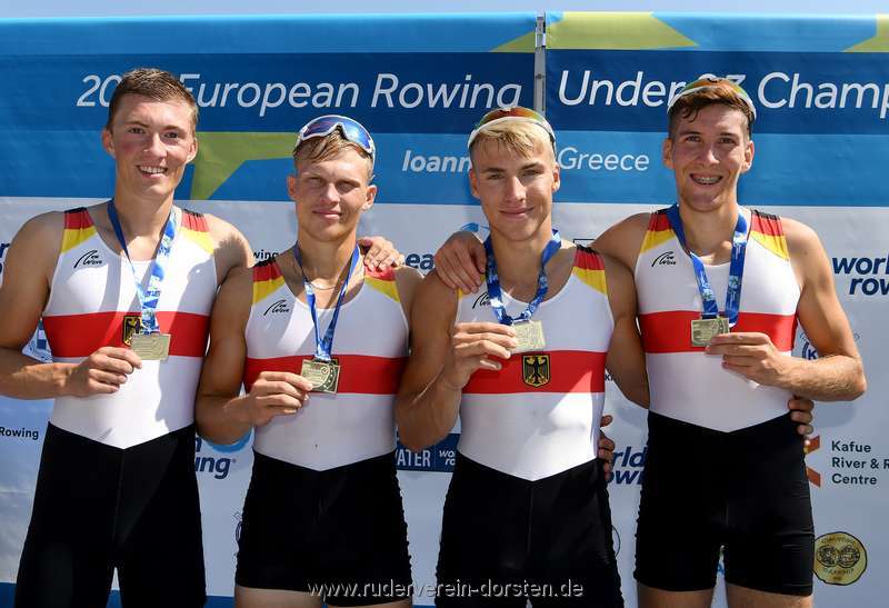Bei den Deutschen U23 Jahrgangsmeisterschaften auf dem Beetzsee in Brandenburg überzeugten Julius Gülker und Hendrik Winkel auf der ganzen Linie. Finalfähige Boote hatte Trainer Sebastian Schmelzer vorab gefordert – eine Erwartung die mehr als übertroffen werden sollte. Allen voran war es Leichtgewichtsruderer Hendrik Winkel, der in Brandenburg mit seiner Renngemeinschaft überraschte. Zusammen mit Joscha Holl (RC Rheinfelden), Fabio Kress und Patrick Hofmockel (beide ARC Würzburg) ging Hendrik im Leichtgewichts-Doppelvierer an den Start. Bei den vorherigen Regatten in Duisburg und Ratzeburg war diese Kombination bereits in leicht veränderter Besetzung erfolgreich an den Start gegangen und hatte die favorisierte und für die U23 WM angedachte Renngemeinschaft aus Hamburg und Kiel bereits mehrfach geschlagen. Durch seine konstanten Top-Leistungen im U23 Bereich hatte sich Hendrik mit seinem Doppelvierer bereits bei der Regatta Ratzeburg in den Fokus der Bundestrainerin, Brigitte Bielig, gerudert. Nun sollte in Brandenburg das Ticket zur U23 EM, die im Herbst in Ioannina/Griechenland stattfindet, durch eine Medaille abgesichert werden. Bereits im Bahnverteilungsrennen am Freitag zeigte der erstmals in der EM-Besetzung startende Doppelvierer der Renngemeinschaft Dorsten, Rheinfelden, Würzburg, dass er den Konkurrenten aus Hamburg den Titel nicht ohne Kampf überlassen wollte. Bis zur Streckenhälfte führte man das Rennen an, setzte einige Akzente und ließ dann das favorisierte Boot ziehen. Im Finale am Samstagabend spielten Hendrik & Co dann auch die Windbedingungen in die Karten. Der Schiebewind machte das Rennen schnell und schob das Feld zusammen. Und mit Wellen - das hatte die Regatta in Ratzeburg bereits gezeigt - kam die junge Mannschaft um Hendrik, Joscha, Fabio und Patrick sichtlich besser klar. Das Trainertrio um Gerhard Holl, Joachim Agne und Sebastian Schmelzer hatte der Mannschaft einen Rennplan mitgegeben, der sich als genau richtig für das Finale herausstellen sollte. Nach 500 m war eine leichte Führung herausgefahren, die bei Streckenhälfte auf bis zu einer Länge ausgebaut wurde. Diesen Abstand verwalteten Winkel & Co bis zum Rennende und wehrten in Führung liegend jeden Angriff der Renngemeinschaft Hamburg/Kiel ab. Mit gut einer Bootslänge Vorsprung reichte es zur Goldmedaille, die das Rennen um die Vergabe der Plätze für die im Juli in Sarasota/USA stattfindenden U23 Weltmeisterschaften noch einmal spannend machte.