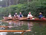 Der geplante Wechsel mit dem Landdienst entfiel mangels geeigneter Anlegestelle, und wir wurden in den Booten das Gefühl nicht los, dass der Vormittagslanddienst das große Los gezogen hatte. Gottseidank ließen wir unsere Stimmung aber nicht wirklich vom Wetter beeinflussen. Kurz vor unserem Ziel an der "Großen Tränke" - einer Umtragestelle auf die Müggelspree - hörte der leichte Regen dann endlich auf. Nun schüttete es so richtig, so dass wir alle auf den letzten Metern klatschnass wurden. Die letzten Weinreserven an Bord wurden vorzugsweise aus der Flasche getrunken, es bestand akute Verdünnungsgefahr! Noch ehe alle auf Land waren, einte uns ein Gedanke: "Das Hören und Verbreiten des Radio-Wetterberichts wird mit Kielholen bestraft!"