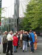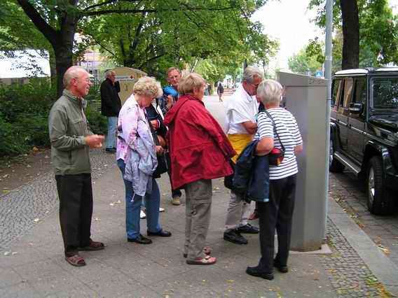 Die kurze Tagesetappe hatte natürlich einen Grund, denn schon am frühen Nachmittag fuhren wir in die Innenstadt zum Potsdamer Platz und nutzten im Kollhoff-Gebäude den angeblich schnellsten Aufzug Europas, um 20 Sekunden später und 90 Meter höher den Ausblick über die Stadt zu bewundern. Einer der dort abgestellten Bären, die überall in der Stadt zu finden sind, wurde rittlings von Brigitte gezähmt.
