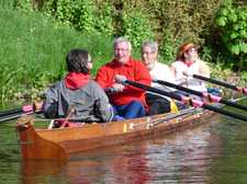 In Garnwerd legten wir für die Mittagsrast an schmalen Bootsstegen vor einem Lokal an. Für jeden Vierer eine eigene Planke von etwa einem halben Meter Breite in eben dieser Höhe über dem Wasser - für Ruderboote nicht so toll. Während ich - gerade ausgestiegen - schon mit der Balance kämpfte, ertönte hinter mir ein kurzer Schrei vertrauter Stimme gefolgt von einem ebenso vernehmlichen Platscher. Sabine hatte Rüdiger aus dem Boot helfen wollen, dieser rutschte aber auf den Exkrementen einer nicht mehr anwesenden gemeinen westfriesischen Deichente aus und verlor das Gleichgewicht. Letztendlich hatte Rüdiger sich schmerzhaft das Bein geprellt und Sabine lag im Wasser. Ohne Grund unter den Füßen und nur mit gemeinsamen kräftigen Händen konnte Sabine aus dem kalten trüben Wasser gefischt werden, so dass ihr die unter diesen Umständen spektakuläre Rettung noch einige blaue Flecken bescherte. Hier und da eine Leiter an den Stegen wär hilfreich gewesen, so etwas könnte auch schlimmer enden...