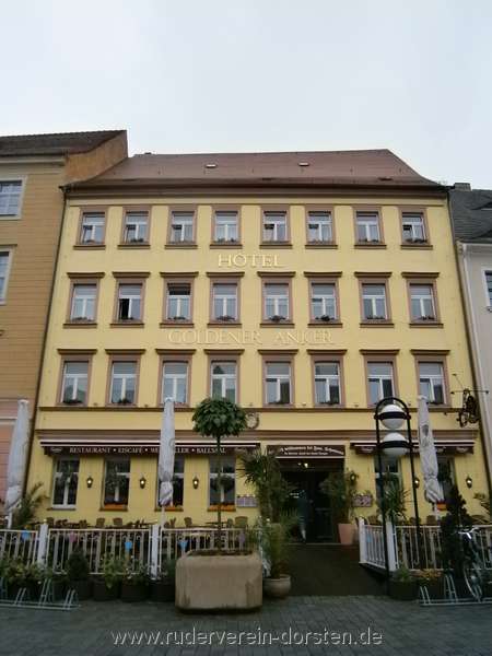 Im baulich verschachtelten Hotel Goldener Anker am Torgauer Markt warteten riesige Zweibettzimmer. Am Abend war ein Tisch für uns reserviert, wo die Teilnehmer der zweiten Fahrtenhälfte zu uns stießen und die der Ersten ihren letzten Abend mit uns verbrachten. An langer Tafel nahmen wir regionale und gutbürgerliche Speisen zu uns, ebenso unter anderem wieder regionale Weine.