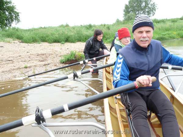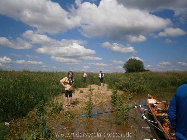 Unter Beschallung von "tausendmal belogener" Andrea-Berg-Karaoke bauten wir die Boote zusammen und brachten sie zu Wasser. In flacher, offener Landschaft, der Himmel wolkenverhangen mit Sprühregen, ruderten wir los. Jede kleine blaue Lücke am Himmel wurde mit Hallo begrüßt. Der geplante Mittagspausenplatz konnte leider nicht angesteuert werden, weil er unter Wasser stand. So haben wir uns alle an einer Buhne mit Sandstrand getroffen, unsere Lunchpakete verzehrt und das Naturklo genutzt.