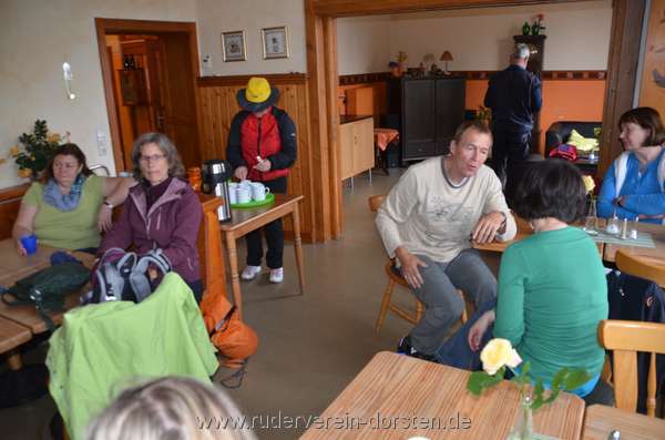 Mit herrlichem Blick auf die Elbe saßen wir zunächst auf der Terrasse über dem Bootshaus, bis nach und nach alle 20 Ruderer eintrudelten. Hier und da großes Hallo, gelegentlich skeptisches Begutachten. Ich persönlich kannte kaum jemanden, nahm erste vorsichtige Kontakte auf. Unten vor dem Bootshaus stand schon der Hänger mit unseren Booten, die Martin in Dorsten, Marl und Bottrop zusammen geliehen, und die ein Trupp mit einem gemieteten Sprinter mitgebracht hatte. Drei Vierer und ein Zweier, jeweils gesteuert, warteten auf ihren Einsatz. Drinnen wurde uns rustikale Kost serviert, die wir dann - die letzten Sonnenstrahlen einfangend - auf der Terrasse verdauten. Auf dem Weg zum Hotel entlang der Elbe gab es dann noch ein Eis, und - ausgegeben vom Fahrtenleiter - einen Absacker.