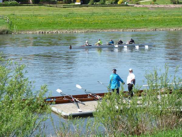 Ein Superfrühstück, hätten wir doch mehr Zeit... Aber wir "müssen" ja rudern! - Von Bodenwerder erst einmal bis Hameln mit Halt im Bootshaus, und danach alle miteinander schleusen, dieses Mal ohne Vorkommnisse. Der Wind hatte aufgefrischt, aber aus der richtigen (!) Richtung, von Osten mit tollem warmen Wetter.