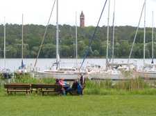 Dienstag - neuer Tag, neue Chance zum Rudern. Heute sollten wir das ausgerufene Programm - also das mit dem Urlaub - richtig in die Tat umsetzen. Am Strandbad Wannsee vorbei mussten wir feststellen, dass die Durchfahrt unter der kleinen Brücke zur Insel Schwanenwerder - auch Nadelöhr genannt - gesperrt war. Tja, dann also außen um die Insel herum. Dieser eine Kilometer mehr muss uns irgendwie geschafft haben. Jedenfalls legten wir schon auf Höhe des Grunewaldturms beim Ruderverein Pro Sport Berlin 24 an und verbrachten dort auf dem sonnigen Gelände mit bester Aussicht wenigstens zwei Stunden zur Regenerierung.