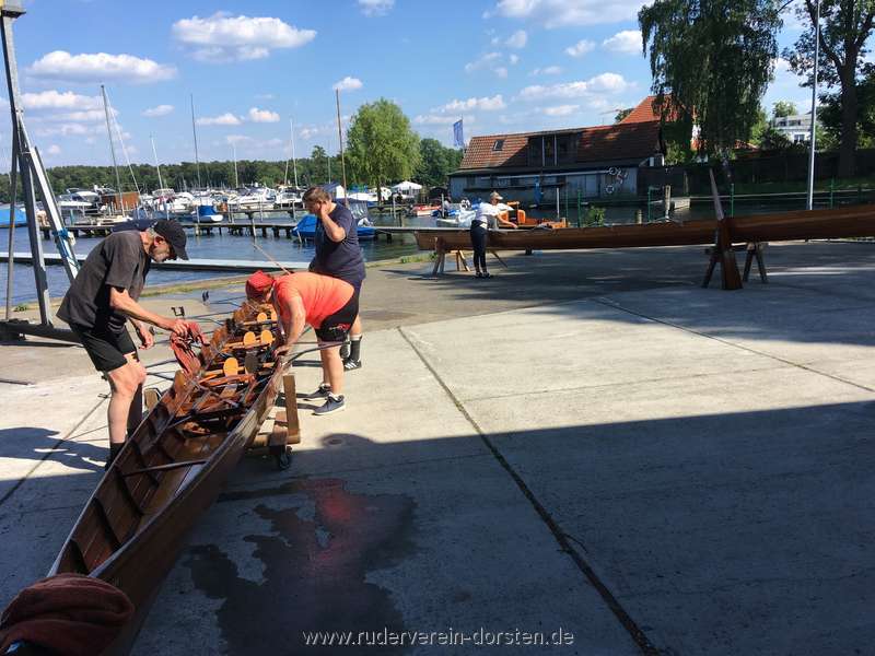 Bekannt war, dass eben schon länger einige Bäume quer im Wasser liegen sollten, die auch einiges Geschick (mit "Blatt lang") zum seitlichen Passieren erforderten. Ohnehin musste man bei maximal halber Kraft öfters stoppen lassen, um die engen Kehren durch kurze Wendemanöver der Vierer zu durchfahren. Etwa 3 Km weiter und von manchen Mücken heimgesucht ging es auf dem weiten Seddinsee die letzten Meter des Tages zurück zum ESV Schmöckwitz.