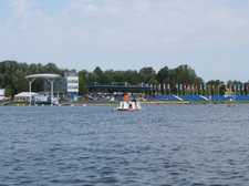 So erfrischt gingen wir auf die letzten Meter vor dem Treffpunkt um 16 Uhr an der Regattastrecke. Die letzten 1000 Meter fuhren wir dort gemeinsam mit unserer "Armada" in einer Rennpause an den Zuschauertribünen der DJM vorbei. Der Anblick unserer bunten Boote erinnerte vermutlich ein bisschen an Asterix und Obelix bei den Gladiatoren ;-) War auf jeden Fall ein hübscher Höhepunkt, der beide Veranstaltungen - WRT und DJM - verband.