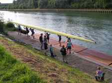 Pünktlich zu 15 Uhr machten sich zwei Vierer im schicken Unilook der neu bestellten Vereins-Shirts auf in die Stadt. In der Energie ruderte die Jugend mit Patrik (Schlag), Sven, Erik, Timo sowie Kristof Wollert am Steuer. Die Delegation der Erwachsenen saß in der Wien: Hartmut T. (Schlag), Marion, Anke, Sabine, Jason am Steuer und René als "Kielschwein".