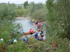 Eine Schleuse galt es nun zu passieren, hinein in den Sproykanal Richtung Kleve. Etwa 15 Boote konnten gleichzeitig schleusen, so dass die Boote in Kleve in Schüben ankamen und in der Innenstadt über eine kleine Mauer hinweg aus dem Wasser gehoben und per Bootswagen zu einer nahegelegenen Wiese gefahren werden konnten, wo die Bootshänger zur Verladung warteten.