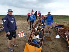 Am nächsten Morgen hieß es wie üblich beim WRT mit den Hühnern aufstehen. Die Luma-Schläfer unter uns bekamen ein Frühstück im Festzelt, von wo es mit sieben großen Bussen bis oberhalb von Rees zum Startplatz der Tagestour gehen sollte. Mit großen Startnummern versehen, aber im Gelände gut gemischt warteten etliche Vierer und wenige Kirchboote auf die Rudererschar. Sabine kam mit einer reinen Frauenmannschaft in einen Seegig-Vierer, das einzige Riemenboot im Feld der rund 50 Boote. Martin und ich durften in Vierern des Ruderclub Borussia Rheinhausen platznehmen. Vorne und hinten gedeckt sollten diese stabilen Rhein-tauglichen Boote den Wellen erfolgreich trotzen.